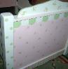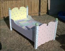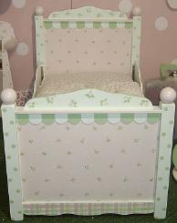 | Scallop design Toddler Bed This is the size of a baby Mattress. Frame measures Approx 34" wide 60"Long. Fits baby mattress approx 28x53 or 29x54 for plumper mattresses. The side rails have a decorative cutout in the middle for easy climbing in and out. The rails (same as diagram below) are drilled for a low setting but you can adjust them to how you might need them. The scallops are dimensional wood so there are many layers of dimension to this bed. It is our best seller for Toddlers. They seem to stop sleeping with Mommies and Daddy, after getting this bed as it is still the same size as their baby bed but not so overwhelming to them |