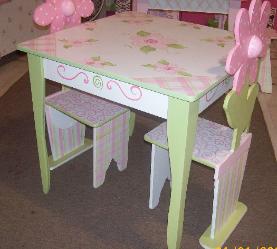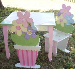 | This is a remake of our original Flower pot table and chair set we did for 12 years and then retired. Too many have asked for it back so we felt the need to offer it for a limited time to the public. The table top is 26: square and is 22 tall the 2 flower pot chairs set height is 12 inches. Great for children up to 10 years of age. Either set can be done in any color combo. Please email after your purchase for special instructions Ships in 2 boxes and the shipping is included in the price $295.00 Set 2 chairs FREE SHIPPING |