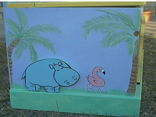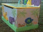 | This is a great addition to a nursery or childs room our Zoodles Toy chest. It can be painted in the more traditional colors that go with the new bedding out now. This blue is more of a Denim blue not what shows. We can drop some of the animals to match your theme. 16"tall with 8" more for the back header 16" front to back and 32" long. Comes with a stay put safety hinge. $325.00 Shipping included |