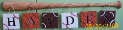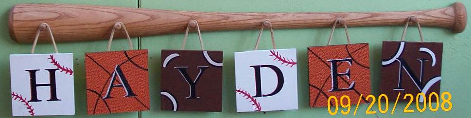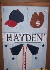 This 16x20 canvas is all hand painted with things for your baseball lover FREE personalization where Haydens name is. It is hung by a real wood small bat stained. The glove is a wooden piece with a half wooden painted ball $39.95 Free shipping |